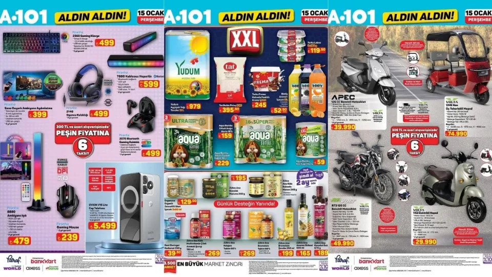 A101'in 'Aldın Aldın' kampanyası 15 Ocak 2026 Perşembe günü başlayacak. Stoklarla sınırlı olan ürünler, belirli mağazalarda veya online satışta bulunabilecek. Fiyat ve ürün bulunabilirliği bölgelere göre değişiklik gösterebilir.